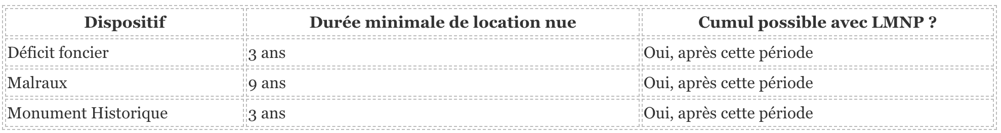 Les dispositifs de défiscalisation (déficit foncier, Malraux, Monument Historique) nécessitent une location nue pendant une durée minimale.